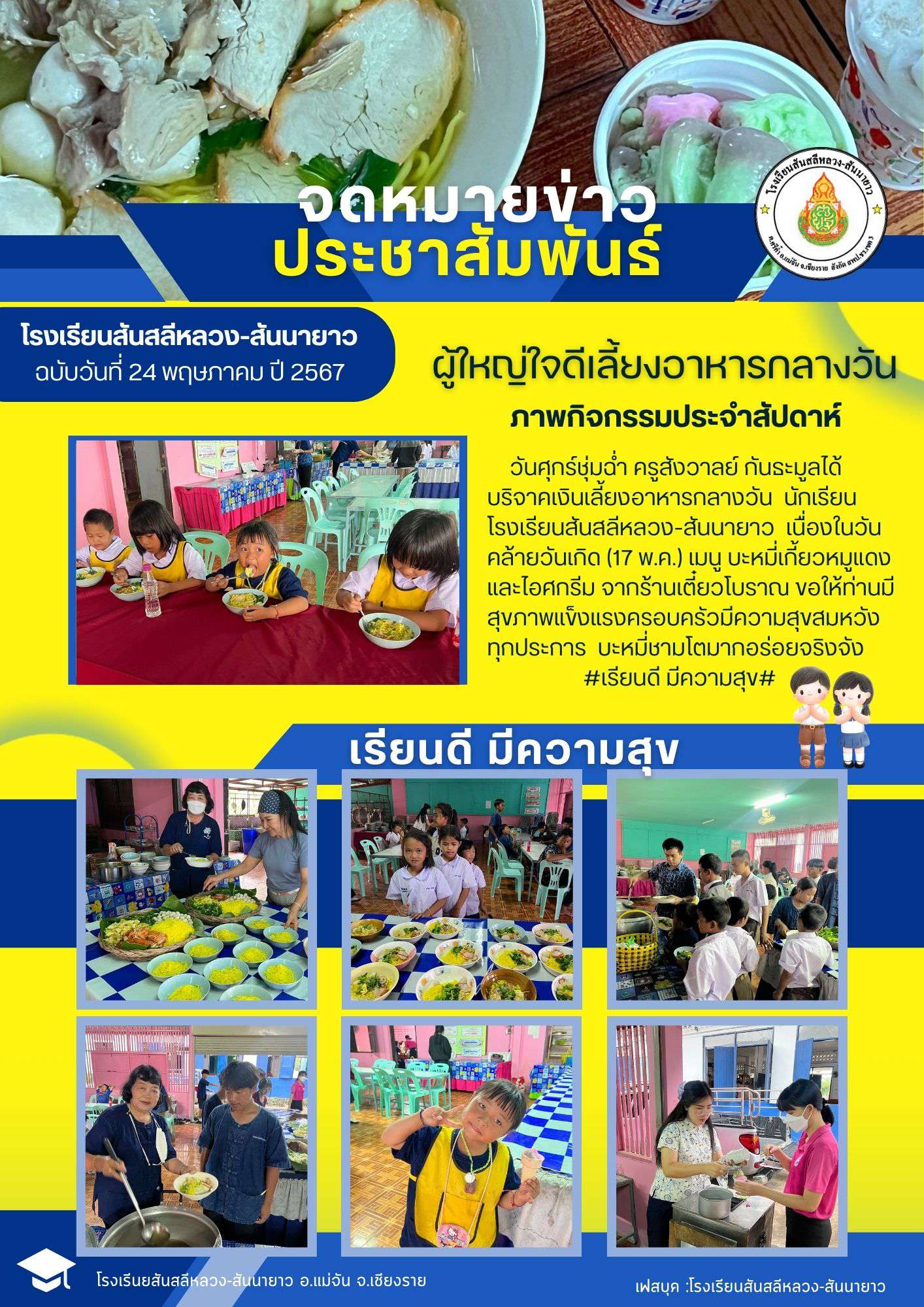 วันศุกร์ชุ่มฉ่ำ ครูสังวาลย์ กันธะมูลได้บริจาคเงินเลี้ยงอาหารกลางวัน นักเรียนโรงเรียนสันสลีหลวง-สันนายาว เนื่องในวันคล้ายวันเกิด (17 พ.ค.) เมนู บะหมี่เกี้ยวหมูแดง และไอศกรีม จากร้านเตี๋ยวโบราณ ขอให้ท่านมีสุขภาพแข็งแรงครอบครัวมีความสุขสมหวังทุกประการ บะหมี่ชามโตมากอร่อยจริงจัง #เรียนดี มีความสุข#