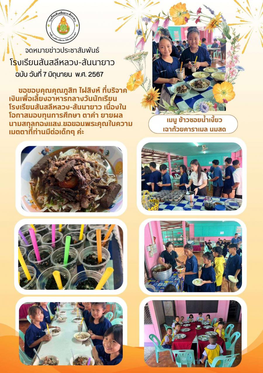 ขอขอบคุณคุณภูสิท ไฝสิงห์ ที่บริจาคเงินเพื่อเลี้ยงอาหารกลางวันนักเรียนโรงเรียนสันสลีหลวง-สันนายาว เนื่องในโอกาสมอบทุนการศึกษา ตาคำ ยายผล นามสกุลกองแสง ขอขอบพระคุณในความเมตตาที่ท่านมีต่อเด็กๆ ค่ะ
