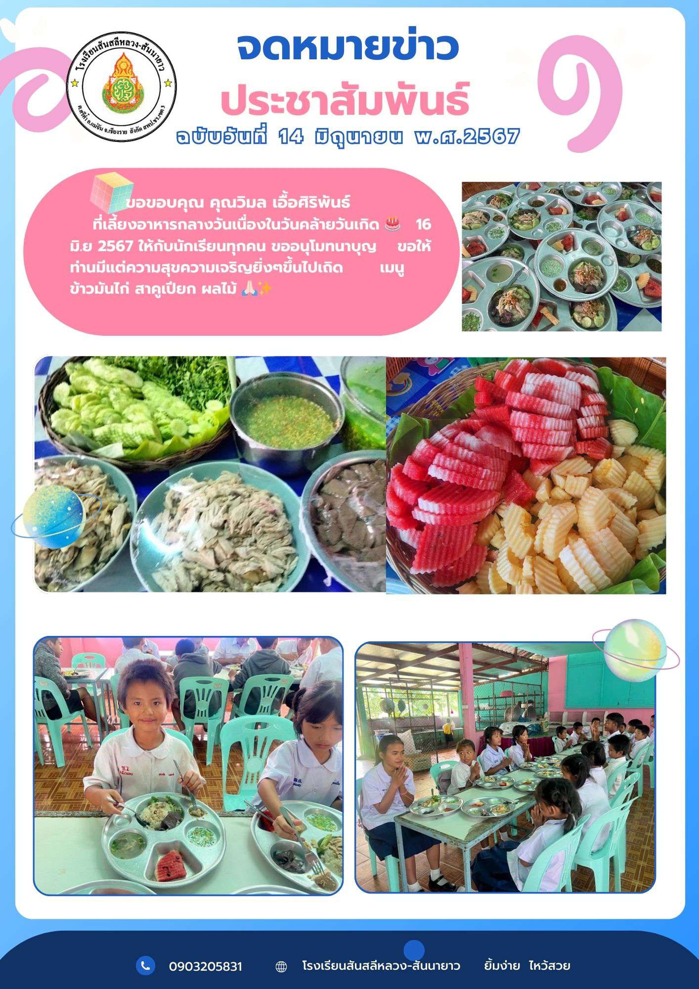 ขอขอบคุณ คุณวิมล เอื้อศิริพันธ์ ที่เลี้ยงอาหารกลางวันเนื่องในวันคล้ายวันเกิด ???? 16 มิ.ย 2567 ให้กับนักเรียนทุกคน ขออนุโมทนาบุญ ขอให้ท่านมีแต่ความสุขความเจริญยิ่งๆขึ้นไปเถิด เมนู ข้าวมันไก่ สาคูเปียก ผลไม้
