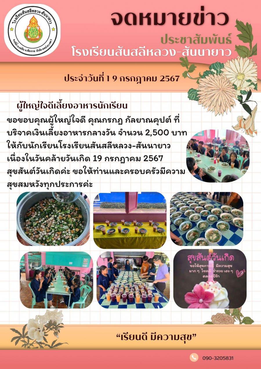 ขอขอบคุณผู้ใหญ่ใจดี คุณกรกฎ กัลยาณคุปต์ ที่บริจาคเงินเลี้ยงอาหารกลางวัน จำนวน 2,500 บาท ให้กับนักเรียนโรงเรียนสันสลีหลวง-สันนายาว เนื่องในวันคล้ายวันเกิด 19 กรกฎาคม 2567 สุขสันต์วันเกิดค่ะ ขอให้ท่านและครอบครัวมีความสุขสมหวังทุกประการค่ะ