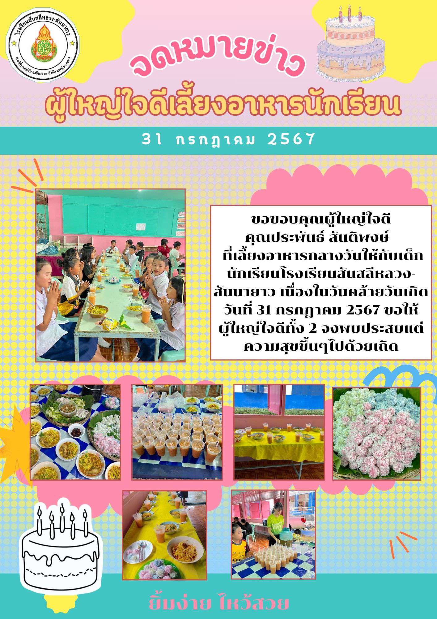 ขอขอบคุณผู้ใหญ่ใจดี คุณประพันธ์ สันติพงษ์ ที่เลี้ยงอาหารกลางวันให้กับเด็กนักเรียนโรงเรียนสันสลีหลวง- สันนายาว เนื่องในวันคล้ายวันเกิด วันที่ 31 กรกฎาคม 2567 ขอให้ผู้ใหญ่ใจดี จงพบประสบแต่ความสุขขึ้นๆไปด้วยเถิด