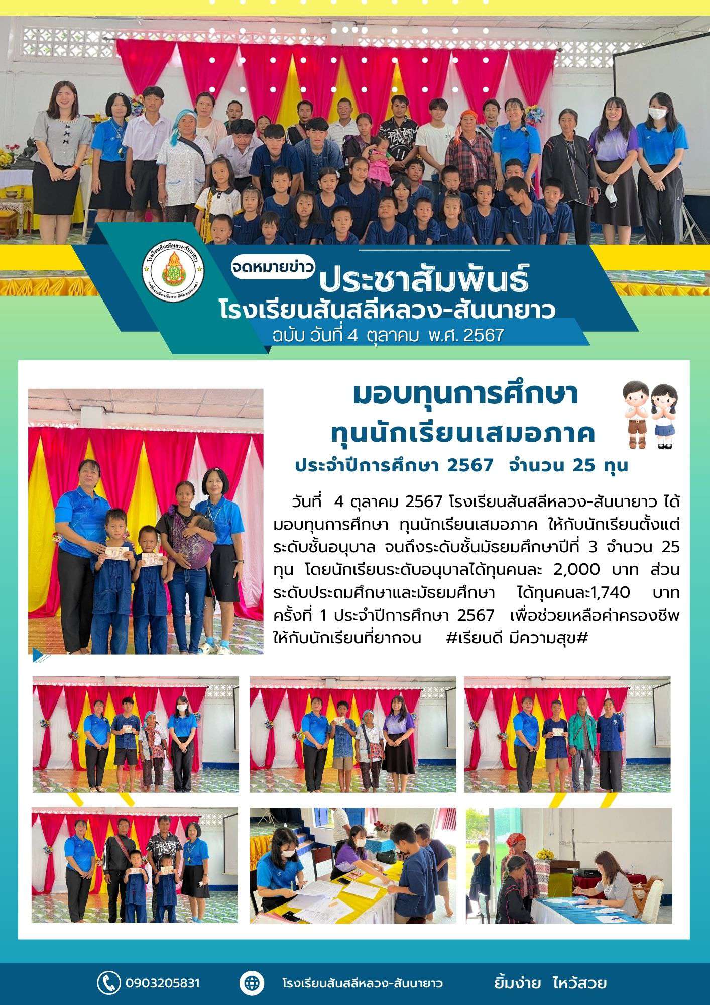 วันที่ 4 ตุลาคม 2567 โรงเรียนสันสลีหลวง-สันนายาว ได้มอบทุนการศึกษา ทุนนักเรียนเสมอภาค ให้กับนักเรียนตั้งแต่ระดับชั้นอนุบาล จนถึงระดับชั้นมัธยมศึกษาปีที่ 3 จำนวน 25 ทุน โดยนักเรียนระดับอนุบาลได้ทุนคนละ 2,000 บาท ส่วนระดับประถมศึกษาและมัธยมศึกษา ได้ทุนคนละ1,740 บาท ครั้งที่ 1 ประจำปีการศึกษา 2567 เพื่อช่วยเหลือค่าครองชีพให้กับนักเรียนที่ยากจน #เรียนดี มีความสุข#