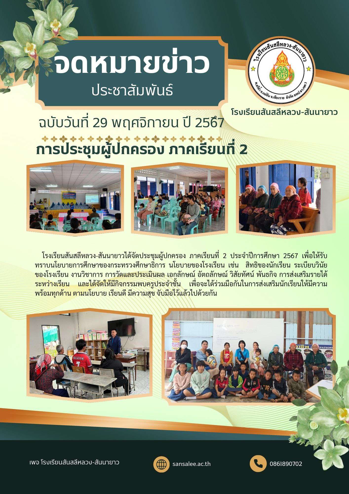 โรงเรียนสันสลีหลวง-สันนายาวได้จัดประชุมผู้ปกครอง ภาคเรียนที่ 2 ประจำปีการศึกษา 2567 เพื่อให้รับทราบนโยบายการศึกษาของกระทรวงศึกษาธิการ นโยบายของโรงเรียน เช่น สิทธิของนักเรียน ระเบียบวินัยของโรงเรียน งานวิชาการ การวัดและประเมินผล เอกลักษณ์ อัตถลักษณ์ วิสัยทัศน์ พันธกิจ การส่งเสริมรายได้ระหว่างเรียน และได้จัดให้มีกิจกรรมพบครูประจำชั้น เพื่อจะได้ร่วมมือกันในการส่งเสริมนักเรียนให้มีความพร้อมทุกด้าน ตามนโยบาย เรียนดี มีความสุข จับมือไว้แล้วไปด้วยกัน