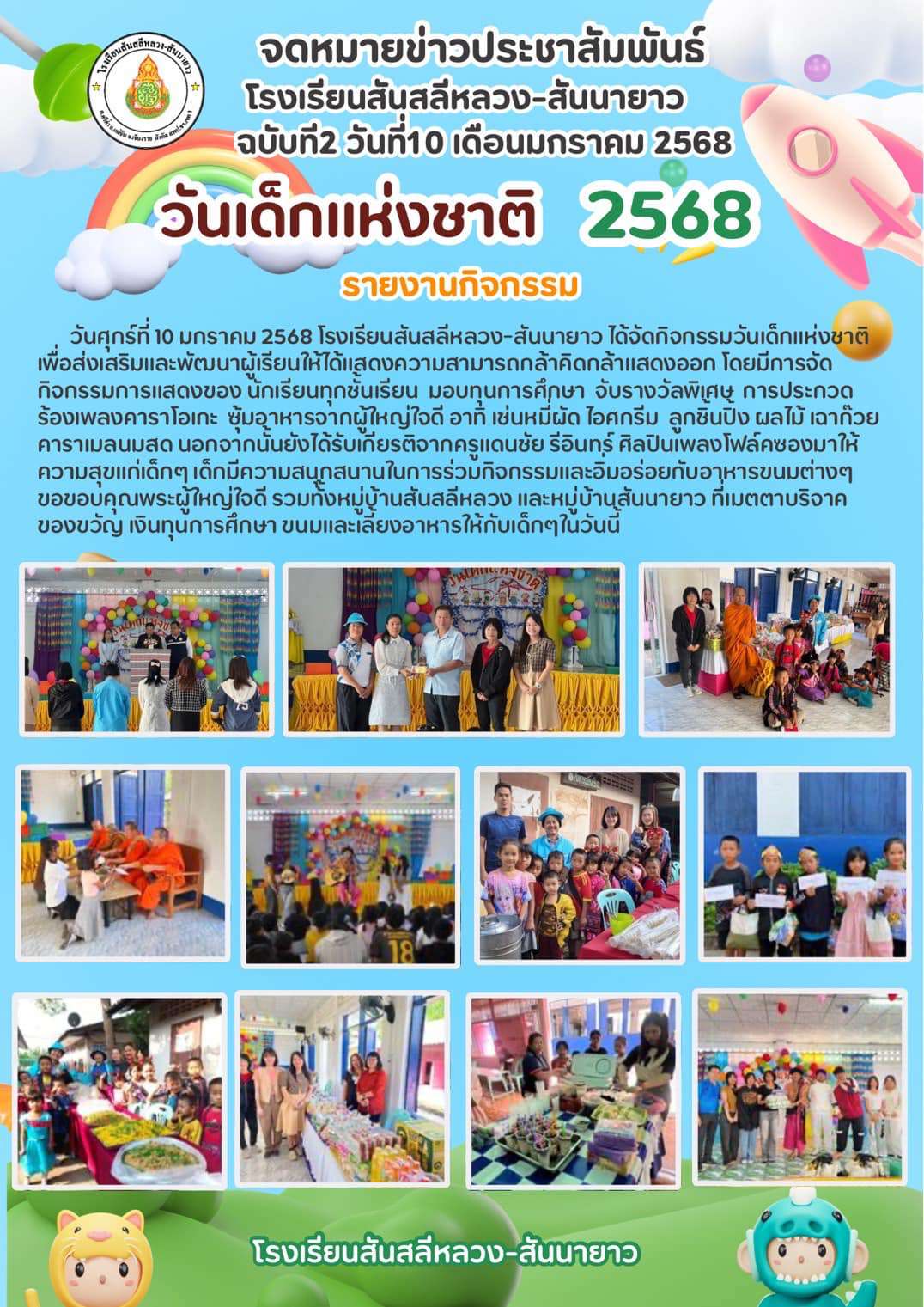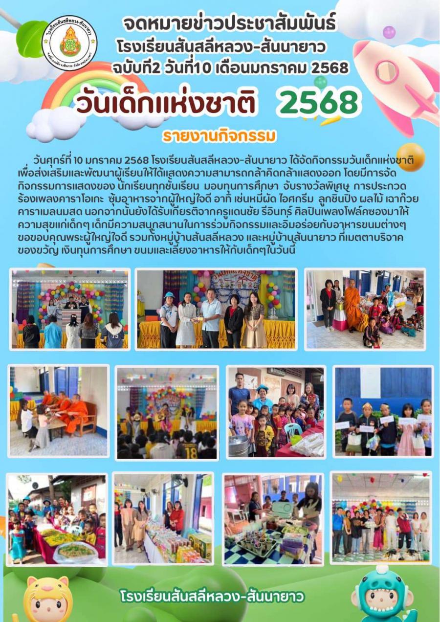 วันศุกร์ที่ 10 มกราคม 2568 โรงเรียนสันสลีหลวง-สันนายาว ได้จัดกิจกรรมวันเด็กแห่งชาติ เพื่อส่งเสริมและพัฒนาผู้เรียนให้ได้แสดงความสามารถกล้าคิดกล้าแสดงออก โดยมีการจัดกิจกรรมการแสดงของนักเรียนทุกชั้นเรียน มอบทุนการศึกษา จับรางวัลพิเศษ การประกวดร้องเพลงคาราโอเกะ ซุ้มอาหารจากผู้ใหญ่ใจดี อาทิ เช่นหมี่ผัด ไอศกรีม ลูกชิ้นปิ้ง ผลไม้ เฉาก๊วยคาราเมลนมสด นอกจากนั้นยังได้รับเกียรติจากครูแดนชัย รีอินทร์ ศิลปินเพลงโฟล์คซองมาให้ความสุขแก่เด็กๆ เด็กมีความสนุกสนานในการร่วมกิจกรรมและอิ่มอร่อยกับอาหารขนมต่างๆ ขอขอบคุณพระผู้ใหญ่ใจดี รวมทั้งหมู่บ้านสันสลีหลวง และหมู่บ้านสันนายาว ที่เมตตาบริจาคของขวัญ เงินทุนการศึกษา ขนมและเลี้ยงอาหารให้กับเด็ก ๆ ในวันนี้