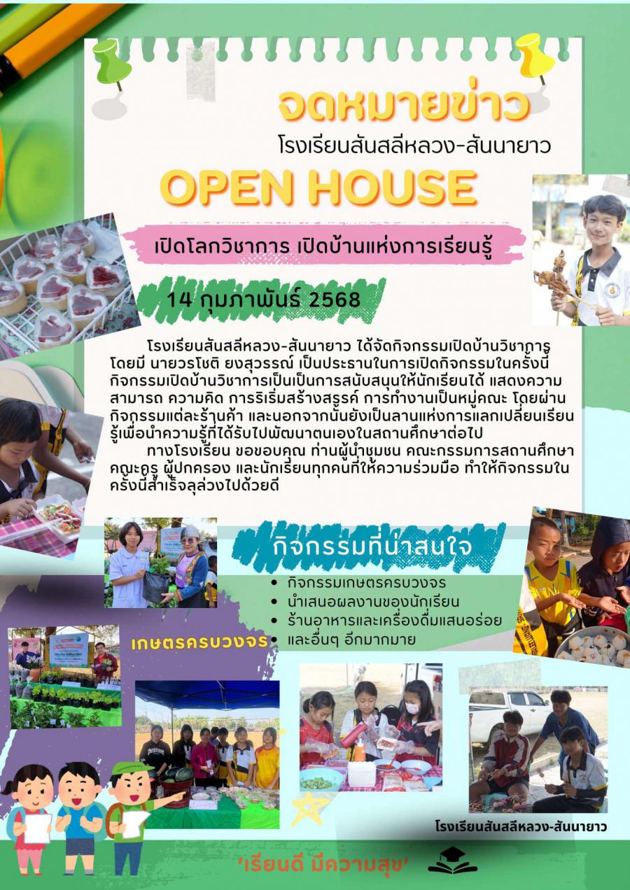 โรงเรียนสันสลีหลวง-สันนายาว ได้จัดกิจกรรมเปิดบ้านวิชาการ โดยมี นายวรโชติ ยงสุวรรณ์ เป็นประธานในการเปิดกิจกรรมในครั้งนี้ กิจกรรมเปิดบ้านวิชาการเป็นเป็นการสนับสนุนให้นักเรียนได้ แสดงความสามารถ ความคิด การริเริ่มสร้างสรรค์ การทำงานเป็นหมู่คณะ โดยผ่านกิจกรรมแต่ละร้านค้า และนอกจากนั้นยังเป็นลานแห่งการแลกเปลี่ยนเรียนรู้เพื่อนำความรู้ที่ได้รับไปพัฒนาตนเองในสถานศึกษาต่อไป ทางโรงเรียนขอขอบคุณ ท่านผู้นำชุมชน คณะกรรมการสถานศึกษา คณะครู ผู้ปกครอง และนักเรียนทุกคนที่ให้ความร่วมมือ ทำให้กิจกรรมในครั้งนี้สำเร็จลุล่วงไปด้วยดี