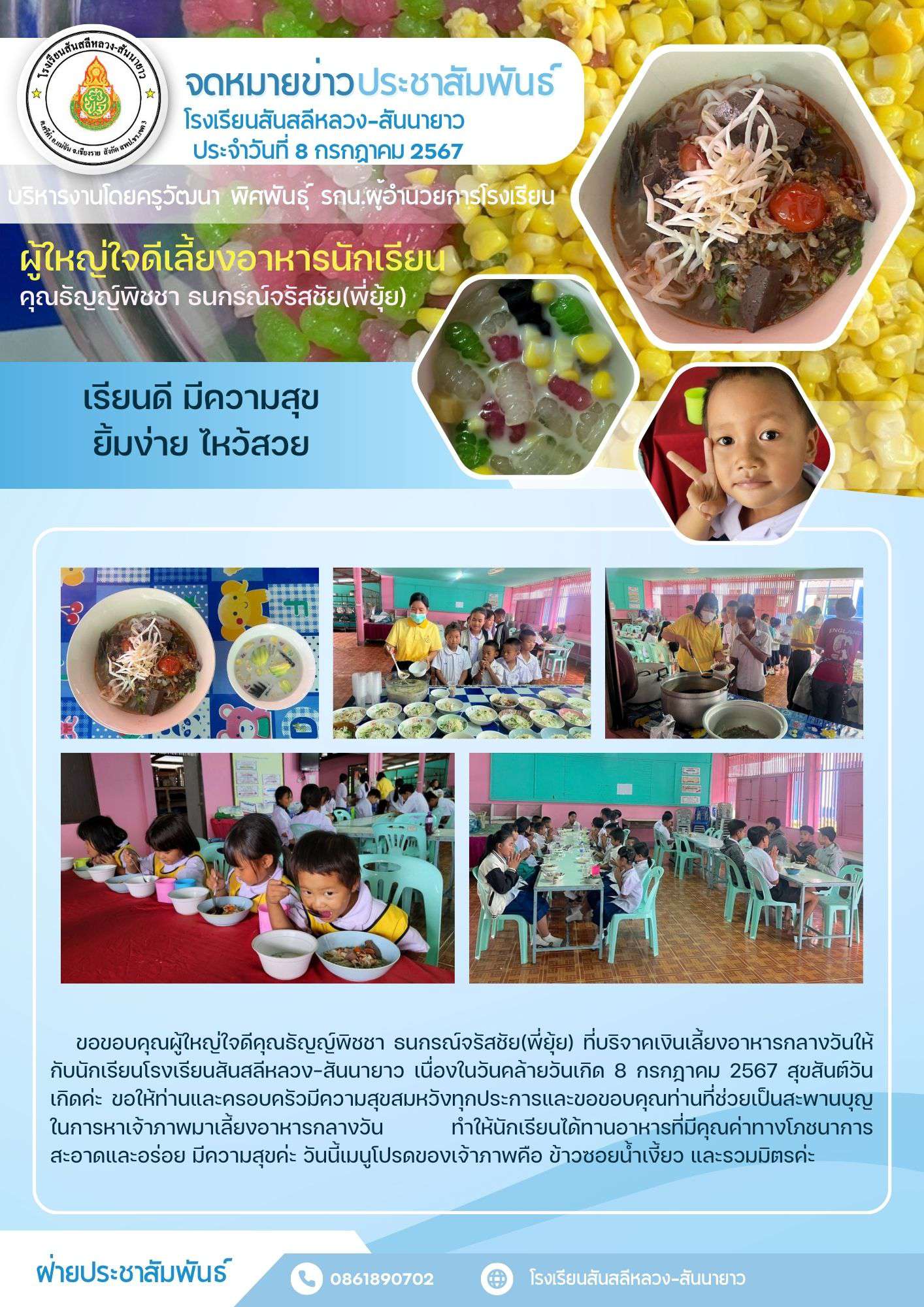 ชอขอบคุณพี่ยุ้ยที่เลี้ยงอาหารกลางวันนักเรียนเนื่องในวันคล้ายวันเกิดค่ะ