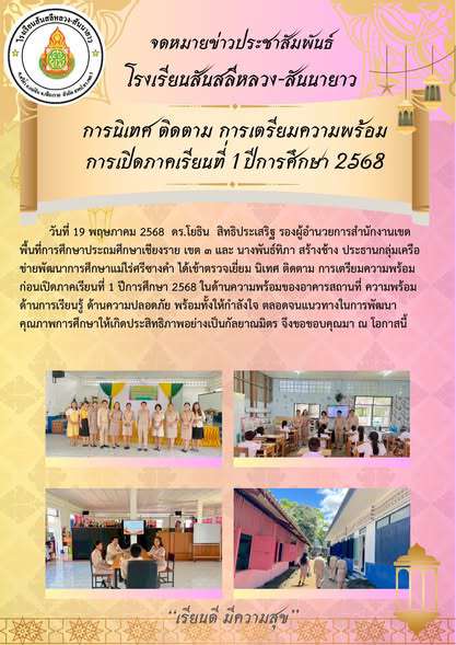ดร.โยธิน สิทธิประเสริฐ รองผู้อำนวยการสำนักงานเขตพื้นที่การศึกษาประถมศึกษาเชียงราย เขต ๓ และ นางพันธ์ทิภา สร้างช้าง ประธานกลุ่มเครือข่ายพัฒนาการศึกษาแม่ไร่ศรีซางคำ ได้เข้าตรวจเยี่ยม นิเทศ ติดตาม การเตรียมความพร้อมก่อนเปิดภาคเรียนที่ 1 ปีการศึกษา 2568 ในด้านความพร้อมของอาคารสถานที่ ความพร้อมด้านการเรียนรู้ ด้านความปลอดภัย พร้อมทั้งให้กำลังใจ ตลอดจนแนวทางในการพัฒนาคุณภาพการศึกษาให้เกิดประสิทธิภาพอย่างเป็นกัลยาณมิตร จึงขอขอบคุณมา ณ โอกาสนี้ค่ะ
