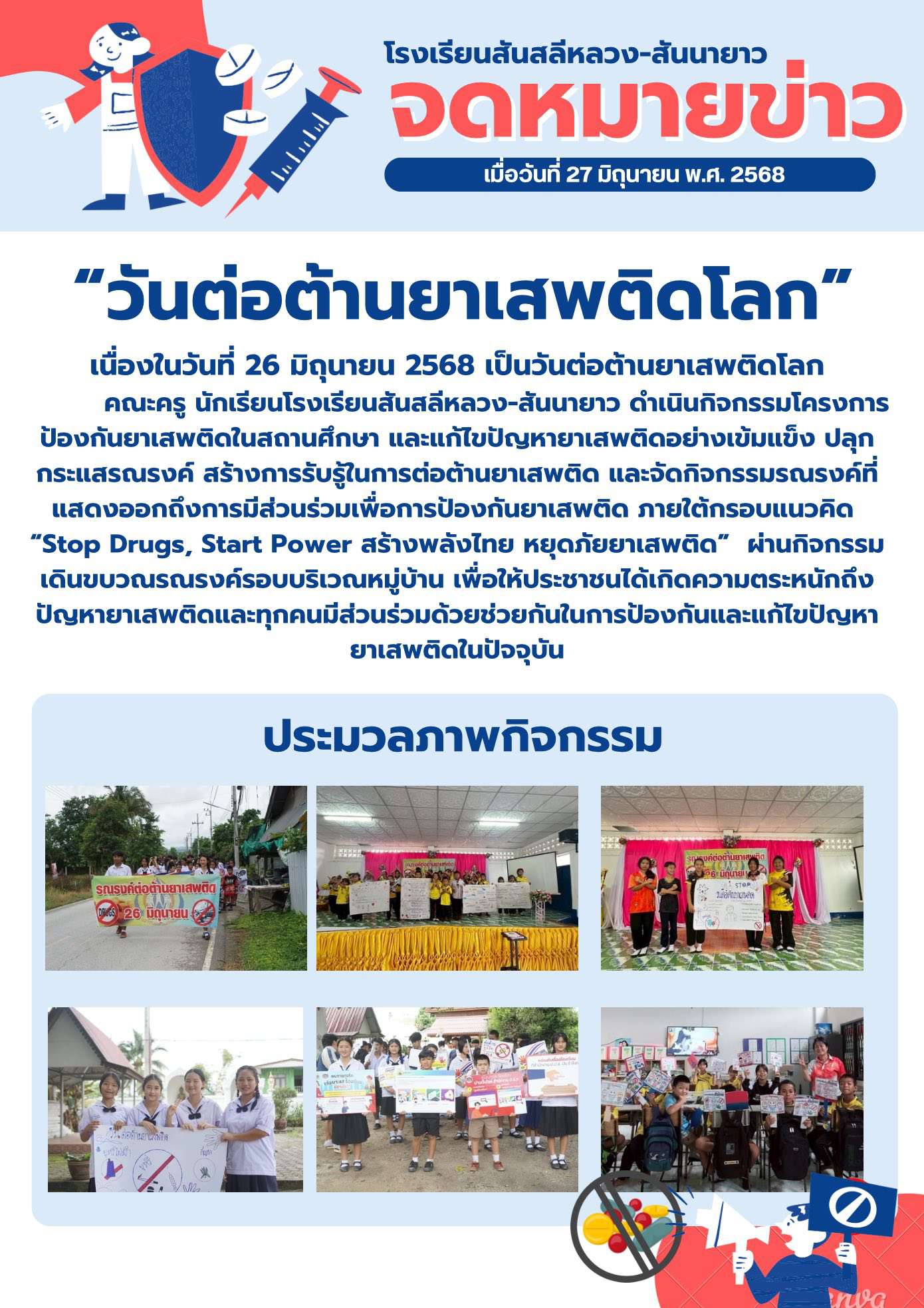 คณะครู นักเรียนโรงเรียนสันสลีหลวง-สันนายาว ดำเนินกิจกรรมโครงการป้องกันยาเสพติดในสถานศึกษา และแก้ไขปัญหายาเสพติดอย่างเข้มแข็ง? ปลุกกระแสรณรงค์ สร้างการรับรู้ในการต่อต้านยาเสพติด? และจัดกิจกรรมรณรงค์ที่แสดงออกถึงการมีส่วนร่วมเพื่อการป้องกันยาเสพติด ภายใต้กรอบแนวคิด “Stop Drugs, Start Power สร้างพลังไทย หยุดภัยยาเสพติด” ผ่านกิจกรรมเดินขบวณรณรงค์รอบบริเวณหมู่บ้าน เพื่อให้ประชาชนได้เกิดความตระหนักถึงปัญหายาเสพติดและทุกคนมีส่วนร่วมด้วยช่วยกันในการป้องกันและแก้ไขปัญหายาเสพติดในปัจจุบัน